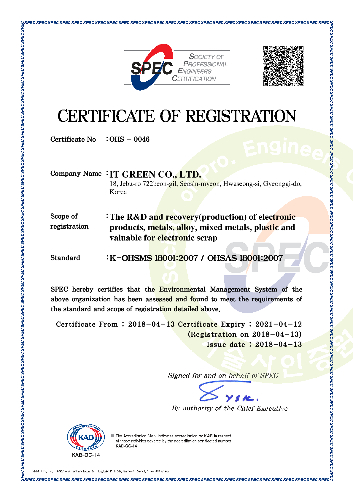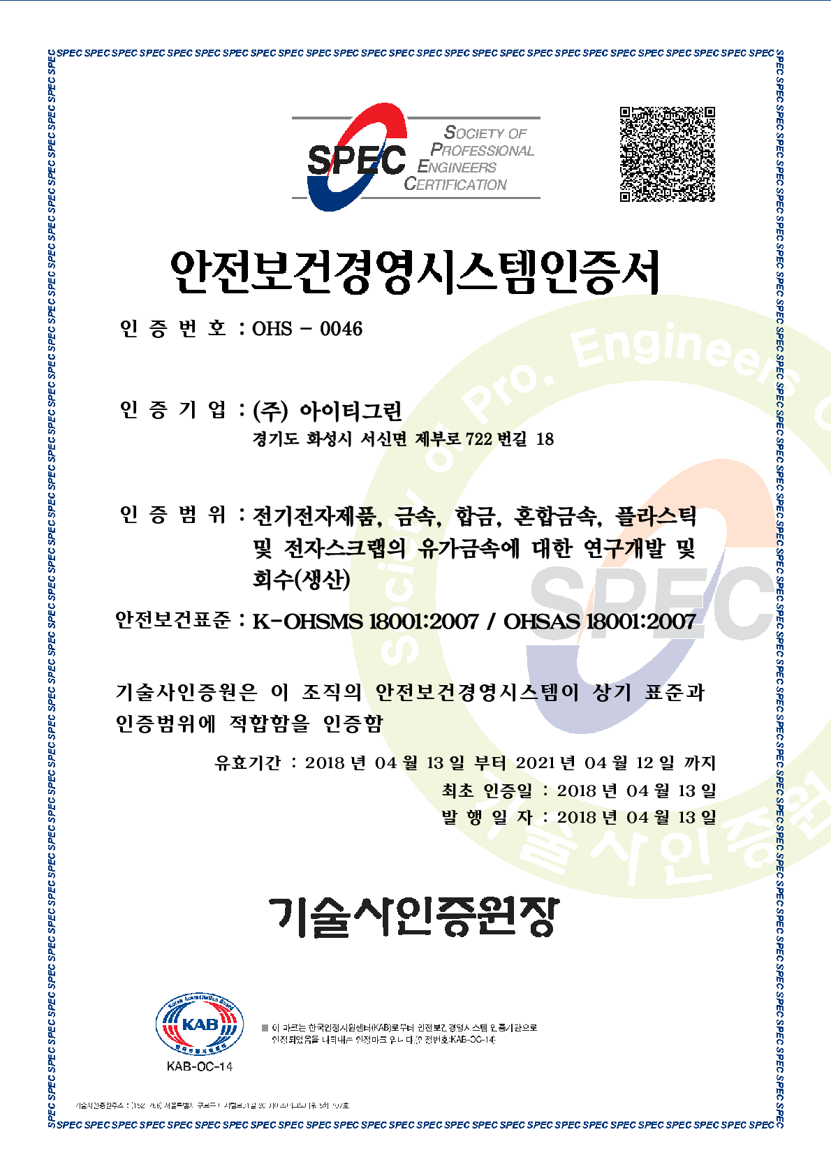 "안전보건경영시스템 인증(OHSAS18001:2007)" _ 2018. 04. 03